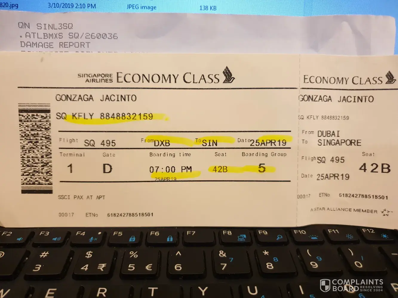 Immediately i filed a complain at Singapore Airlines Lost and Found Section. A copy was attached on this complaint report.