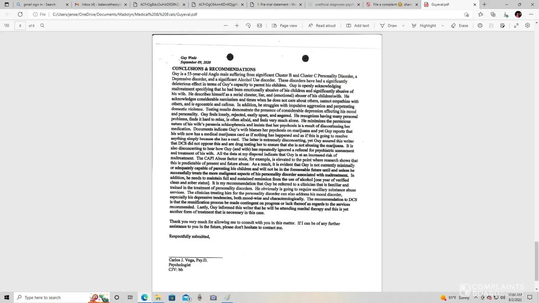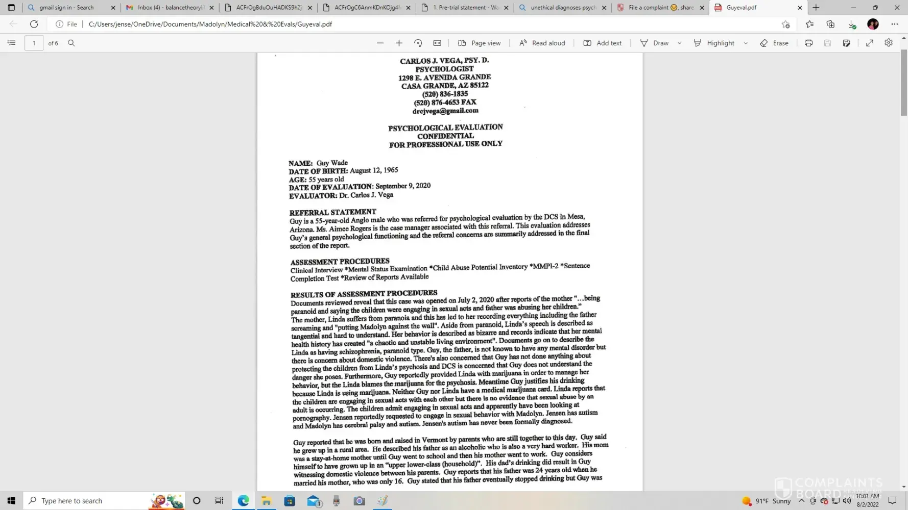 Read full complaint and 2 commentsDr. Carl Vega, Psychologist - Psychological evaluation