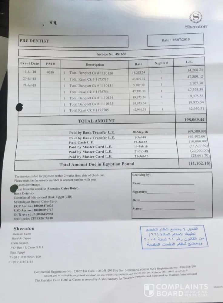 Dear sir/Madam, The Sheraton hotel has always had high standards throughout the world and including Egypt, But Unfortunately Im here to inform you of my dissatisfaction with your service, On 20th of July I have encountered a problem with your managing team in Sheraton Cairo branch which is serving Unsealed water bottles which have been filled from old...