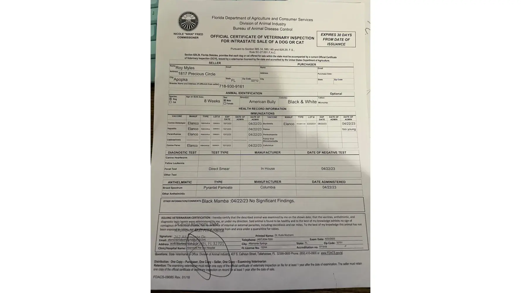 Bought a puppy for $2,000 From Roy miles the day after i bought the pup he had blood stool, breeder stated it was from deworming. The issue proceeded to get worse and was still notifying breeder that the health certificate he gave me expired 4 months ago. Pup is suspected of having parvo. Breeder still declines to give money back for unhealthy puppy. He...