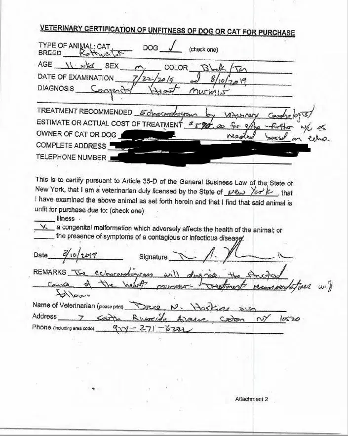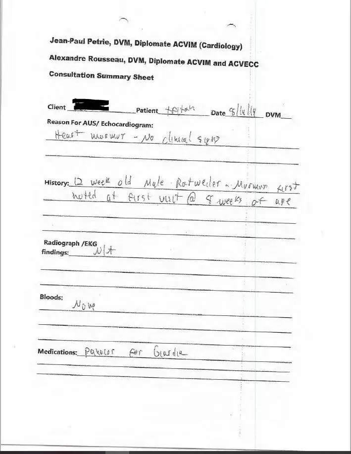 We picked our purebred import rottweiler puppy from dkv rottweiler in ga on 7/20/19 and drove all the way back to nyc. On 7/22/19 we were told that our puppy had a level iii/vi heart murmur. We immediately notified dkv of the situation and they spoke with our vet. They contributed the heart murmur from traveling, new smell, new environment etc. On 08/19/19...