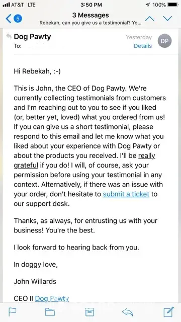 The 5th picture is an email from the supposed CEO of Dog Pawty. When I responded I got a return email about a potential virus... yay me! Anyhoo... I can guarantee you that Mr. John Willards does not want my testimony in his precious portfolio as the customer service leaves a lot to be desired. .