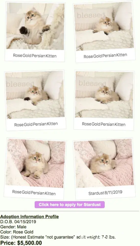 This is a sham of breeder. Sue Johnson of Doll Face Persian Kittens . com has spent quite a bit on marketing and building her website. She can because she charges anywhere from $3, 000 to $11, 000 for her kittens. She claims to be CFA associated however I contacted CFA and they are banned! Of coarse how is there such a color as "Rose Gold" persian kitten. No such color in CFA. They do have nice pictures of staged scenery, but if you want a recent snapshot of the kitten they will charge $300. What phonies.