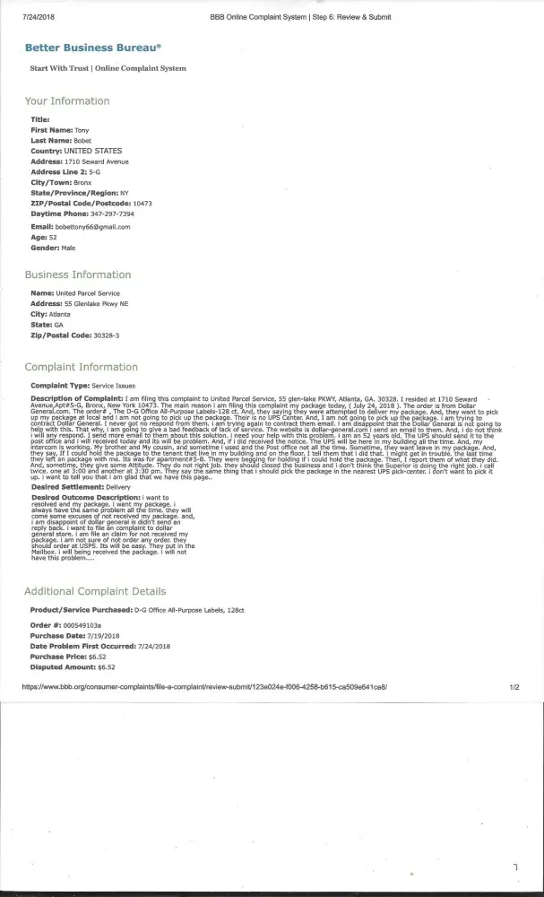 My name is Tony Bobet. I am filing an complaint to Dollar General online. I order item on July 19, 2018. And, I supposed to received on July 24, 2018. The item is D-G Office All-Purpose labels 128 ct. I pay for $6.52. The UPS.com suppose to deliver the package on July 24, 2018. They want me to pick up the package. I file an complaint to Dollar General.com. They locate at 100 Mission Ridge, Goodlettsville, TN 37072. Telephone, [protected]. i try to contract them and stop picking my phone. I want an full refund. I just received the item open. My brother open the package with my permission.
