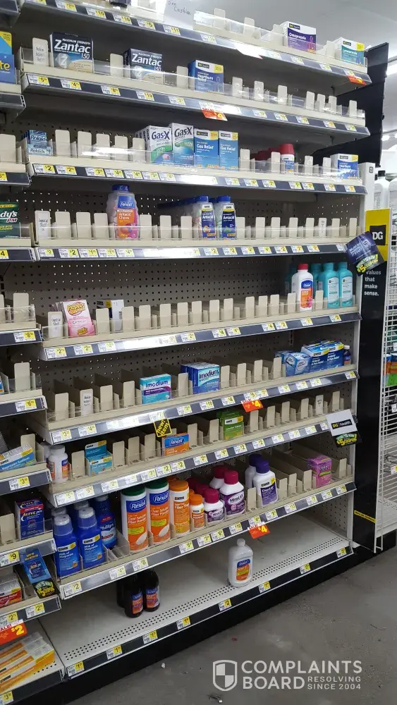 The store is a mess! It has been for sometime now and for a short time (very short) it slightly improved. There is no product on the shelves (I have pictures), carts with containers containing stock sitting throughout the aisles in the store posing a fire hazard (again I have pictures). It seems the product is put out on the shelves but the many empty shelves remain. There hasnt been batteries or medicine supply for months! Limited dog food selection, cat litter, detergent, light bulbs, vehicle oil and so on and so forth. The Family Dollar just a mile away always has plenty of most every product but for alot of people it is less convenient and closes earlier. At this point DG is inconvenient since you go for a few things and the store only has one of what you need. I have worked retail before and this would not be tolerated! I see complaints on fb all the time about our local DG. I work a full time job 5 days a week and have entertained the thought of applying to just show the emoloyees there how to get stuff done. But I cannot fully blame them as their higher ups hold just as much responsibility in this matter. Its a shame this store is in such a shape. I would appreciate a follow up phone call as to how this matter will be addressed. Thank you.