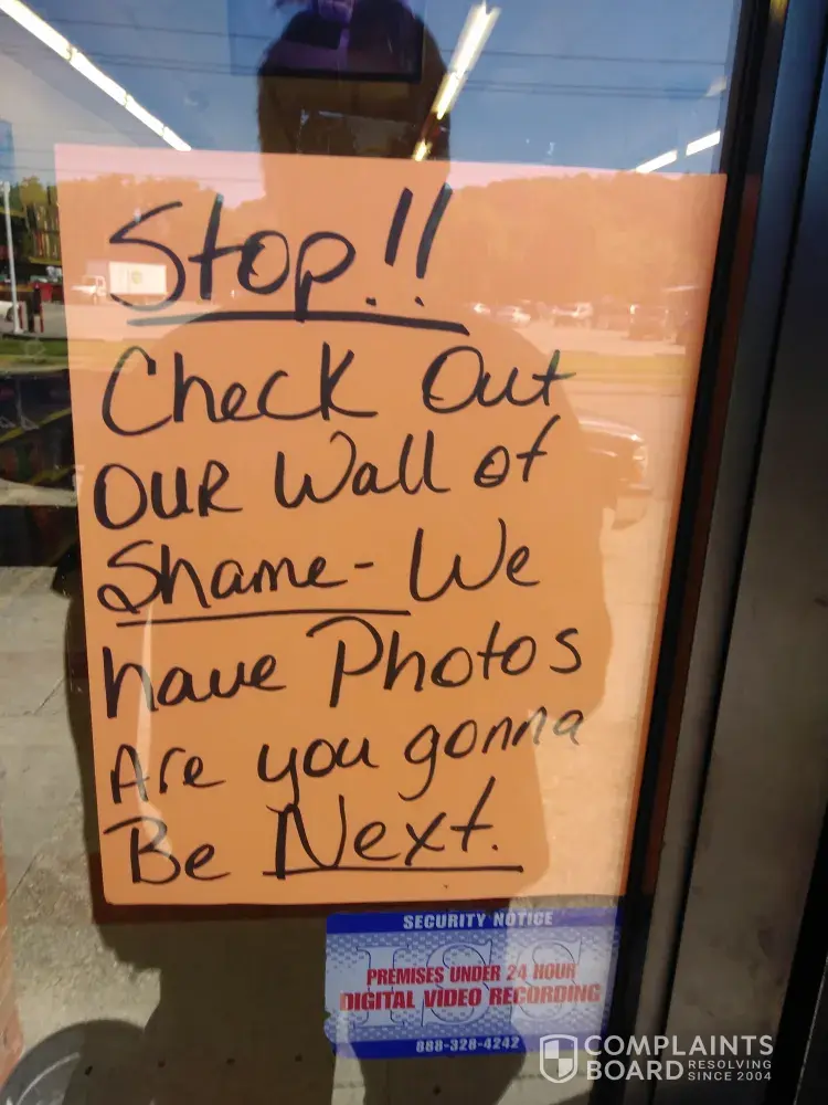 Sign on front door days "stop! Check out our wall of shame. We have photos are you going to be next?". 5th Ave store.