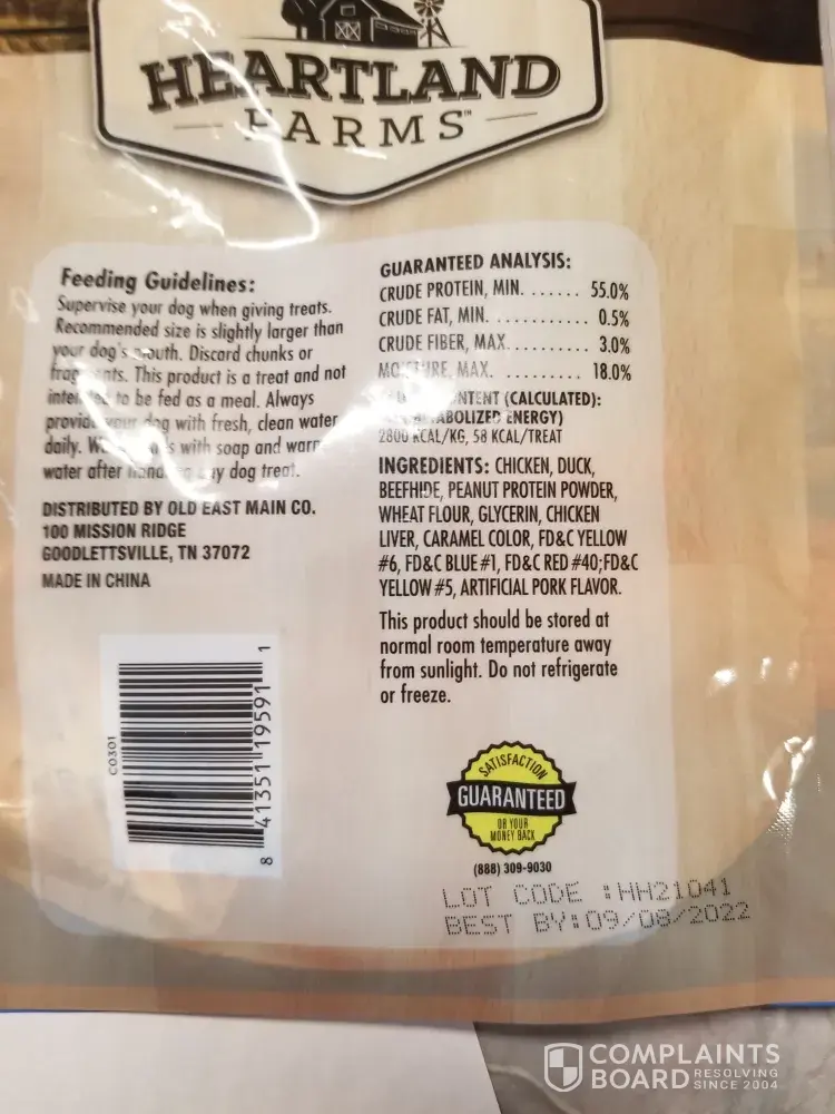 I started buying heartland treats because they were made in the USA. Then I recently bought a bag of the Triple Flavor kabobs treats that my dogs love. I noticed they weren't really eating them up like normal. I smelled the treats and it took my breath away. They literally smelled like [censored].. excuse my language. I looked on the back of the bag & noticed...