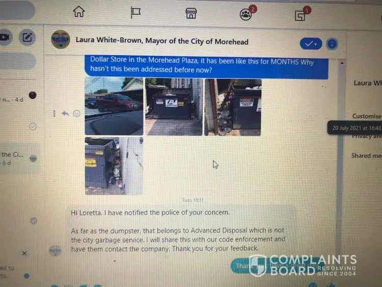 I contacted Dollar General several days ago regarding the Dollar General www.dollargeneral.com 208 Morehead Plz, Morehead, KY 40351 · < 1 mi [protected] The dumpster area is located behind the store and in the middle of our town. I have also contacted our Mayor Laura White-Brown about the appearance of these unsanitary conditions. This dumpster has been...