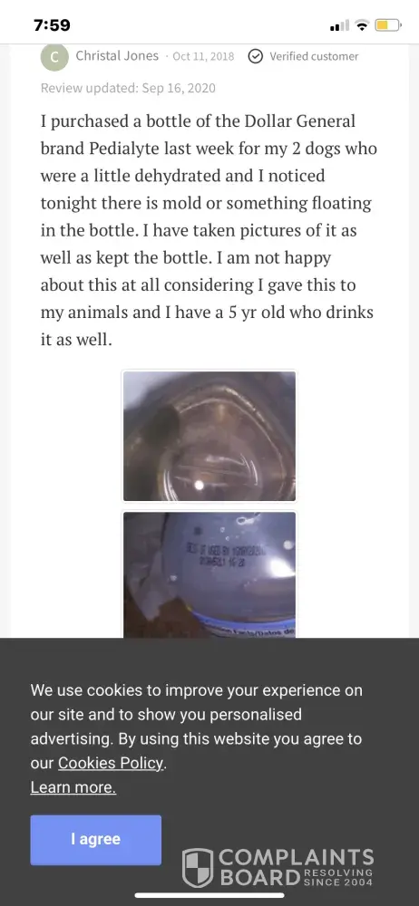 Re Rena Grigsby Sep 16, 2020 Verified customer I purchased a couple of bottles of this pedialyte at my local Dollar General, I have been sick as a dog after taking it for over a week and 1/2 with my water. Today I noticed it's full of mold!! I'm sick at my stomach and Diarrhea is unreal headache going on for days!!! I made an appointment with...