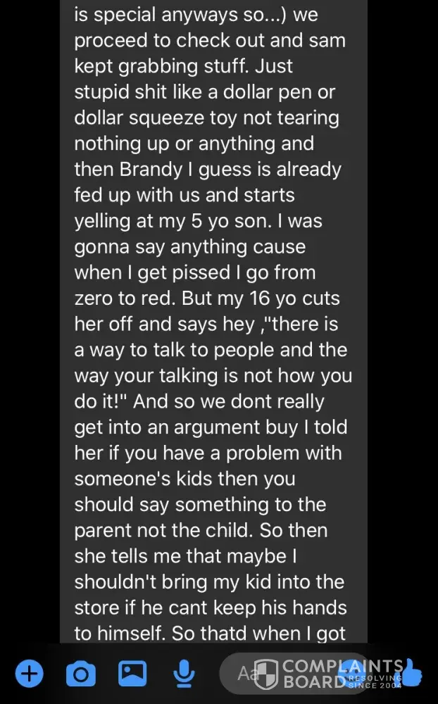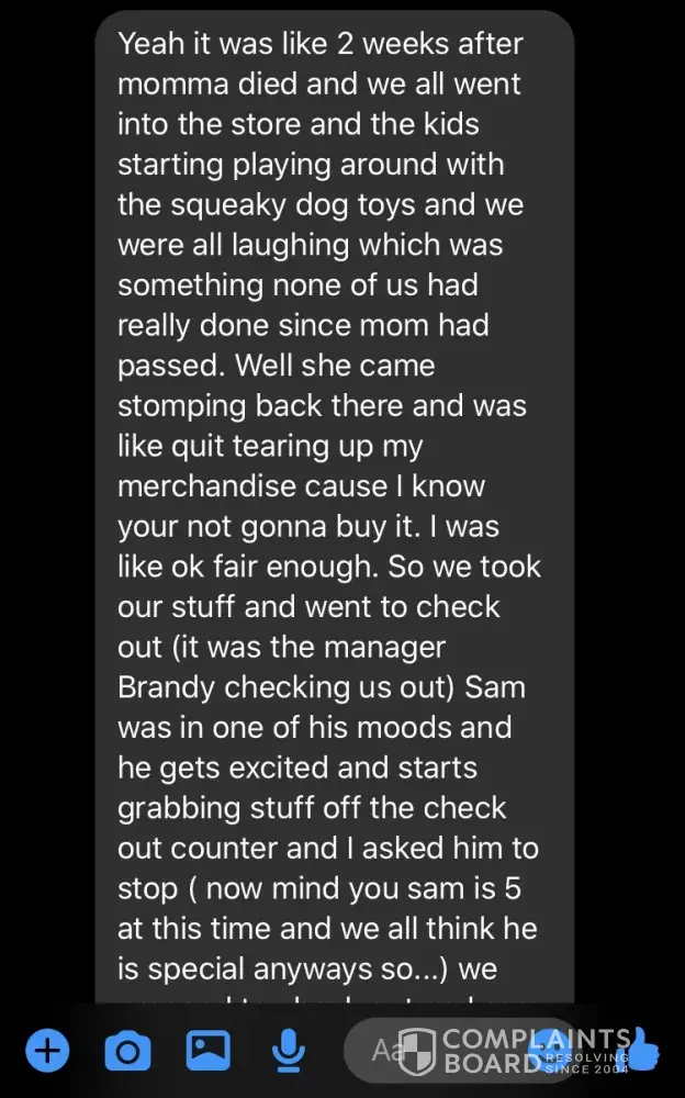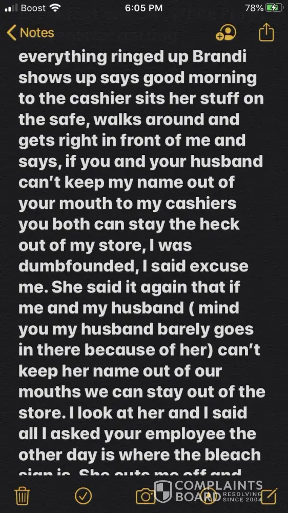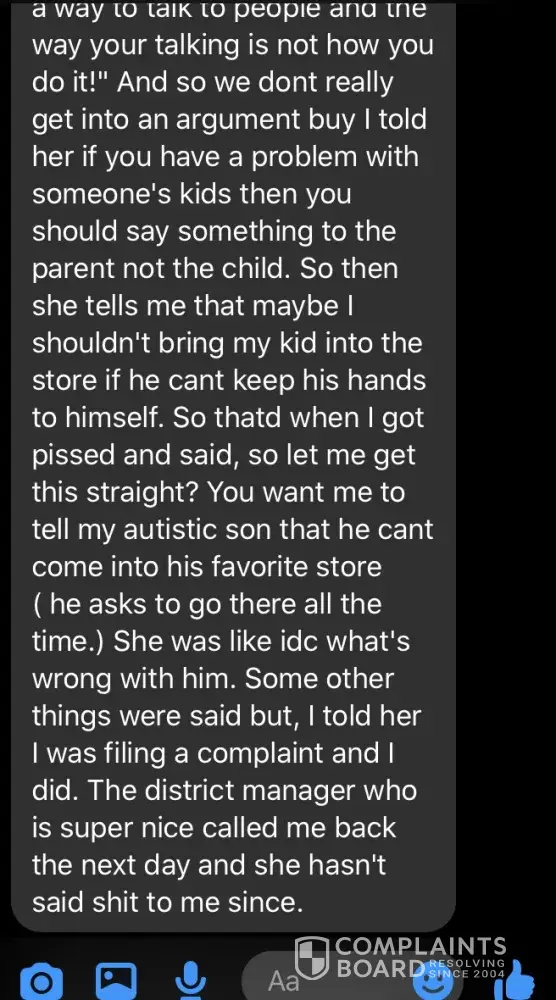 I am not one to complain at all and out of my 28 years on this Earth, this is the first complaint I have ever lodged but I feel the need to because I no longer feel comfortable shopping in my local store. Unfortunately, until she is either reprimanded for her actions or replaced entirely, I will no longer be bringing my business to this company.