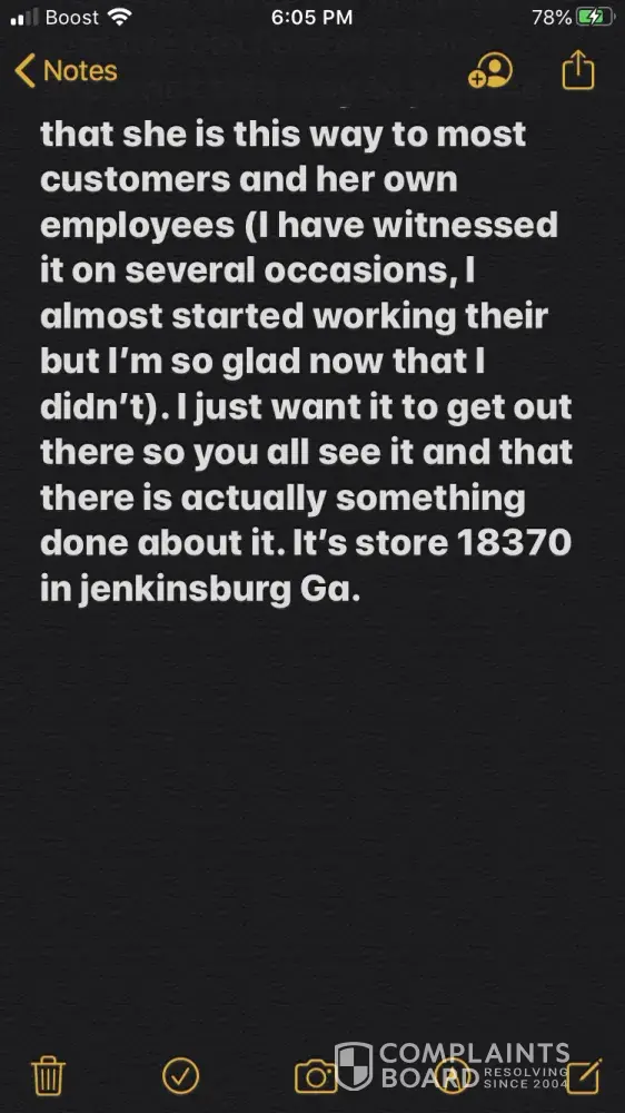 I have talked to the DM in my area about my issues. But I want to show the Dollar General corporation what's going on in Jenkinsburg Ga. I have blocked out names for privacy reasons. I also wrote my own "complaints" in my notes will also be sending that as well. If you need anything else my Email address is [protected]@gmail.com