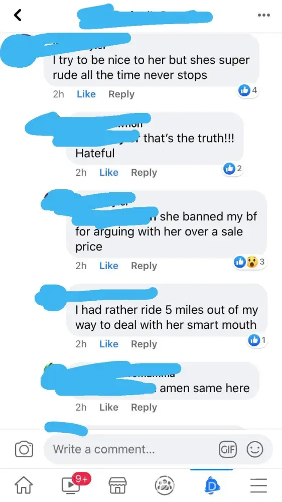 I don't want to say anything to her individually because other people in the community who have brought things of this nature to her attention, have been permanently barred from the store and on two separate occasions, I personally witnessed her call law enforcement, make up some incident that didn't occur (I witnessed the entire event), and on one of those occasions, had someone arrested on those bogus charges for absolutely no reason other than they were trying to let her know that her behavior towards some of her customers needed to change.