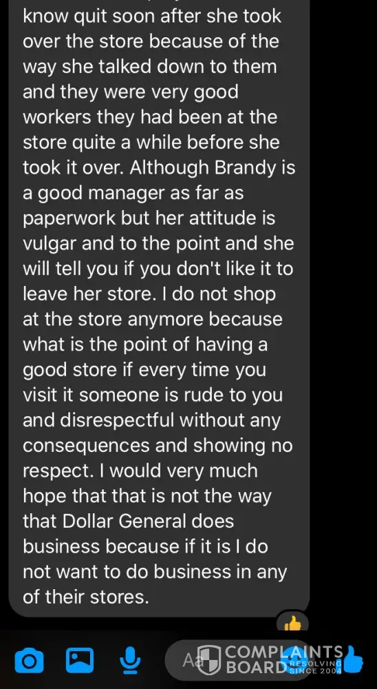 I have been a loyal Dollar General customer for several years and have been shopping at my local store (#11176) since the day it opened its doors. I have never had a problem until a couple of years ago when this lady was promoted to store manager.