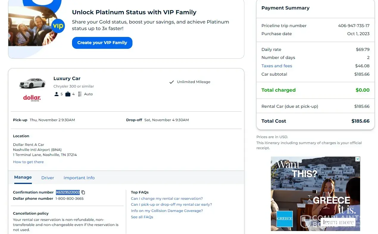 Travis Hanger 100 Wayne 340 Piedmont, MO 63957 [protected] I made a reservation 11/02/2023 on Priceline.com, my rental with taxes and fee was $185.66. I get to the desk in Nashville airport and they advise the vehicle was not available. They told me they would give me another one like it. I asked if I would have an up charge and they said "no". The...