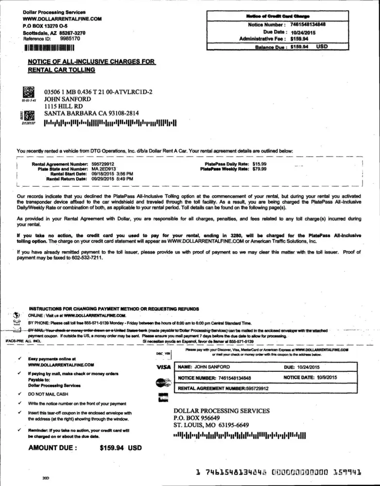 6/25/2014 to 7/02/2014 I rented a car from Dollar Rent a Car (Rental Agreement #1J0237112) from the Providence airport (where I flew in and out of) to visit my sick mother in Groton, CT. A few weeks after the trip I receive a notice in the mail (Notice #[protected]) from a sub-division or agency Dollar sub-contracts tickets/tolls issues with (Dollar Processing Services) whereby the notice accused me of going thru a pay-toll in Chicopee, MA (near Springfield) and that since I did not rent the Dollar transponder I was being penalized the toll of $3.85 and a $15.00 administration fee.