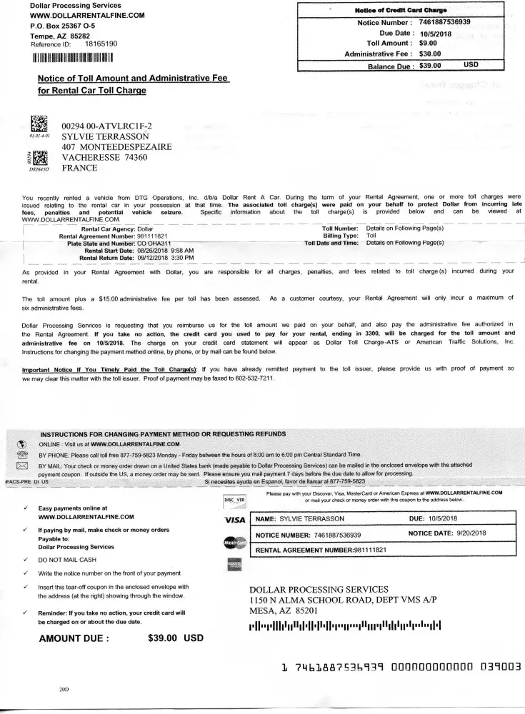 they had our credit card number and could easily take the money for the tolls without thèse ' administrative Fee' as you can look on the attachment (30 $)