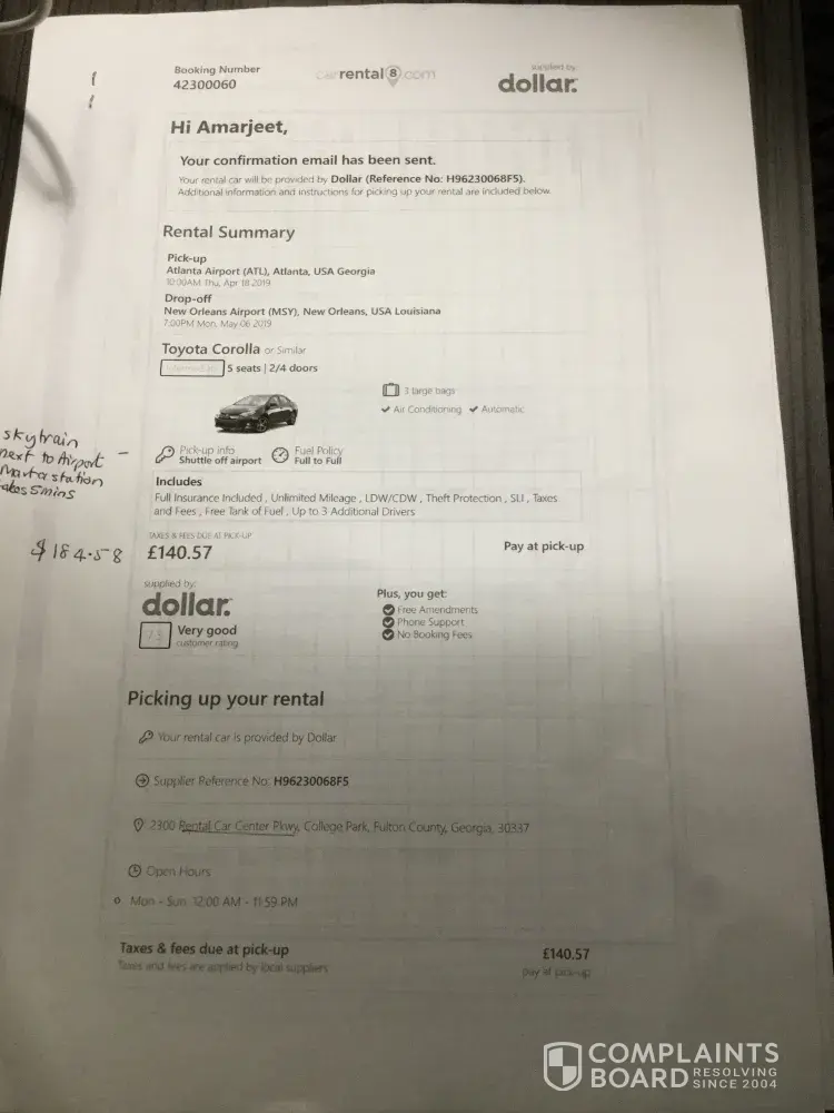 This is my third attempt to submit this complaint. On Aug. 2 I arrived as booked by 8 p.m. to pick up a car #[protected] having used rental cars.com for the first time. I had a copy of the promised price. First problem was arriving at the Dollar counter in the terminal and finding it not staffed. After walking around searching for someone an Avis attendant suggested I go to the Hertz counter in the garage. I found one gentleman in a Dollar booth trying to help 4 people. When I finally got to the window there was no reference to my prices, nor reference that I had already been charged $84.15 on July 30 and $48 on july 31 . He couldn't confirm that my reservation was this pricing, also taxes and fees would be the 28.55 showing on my reservation papers. I panicked and asked to cancel the reservation. I found a Enterprice counter which conducts rentals upfront with pricing clearly noted on paperwork. Since I rented with a another company I want the $84 dollars refunded, and the $48 charge explained. Gina Seay gmseay31@gmail.com