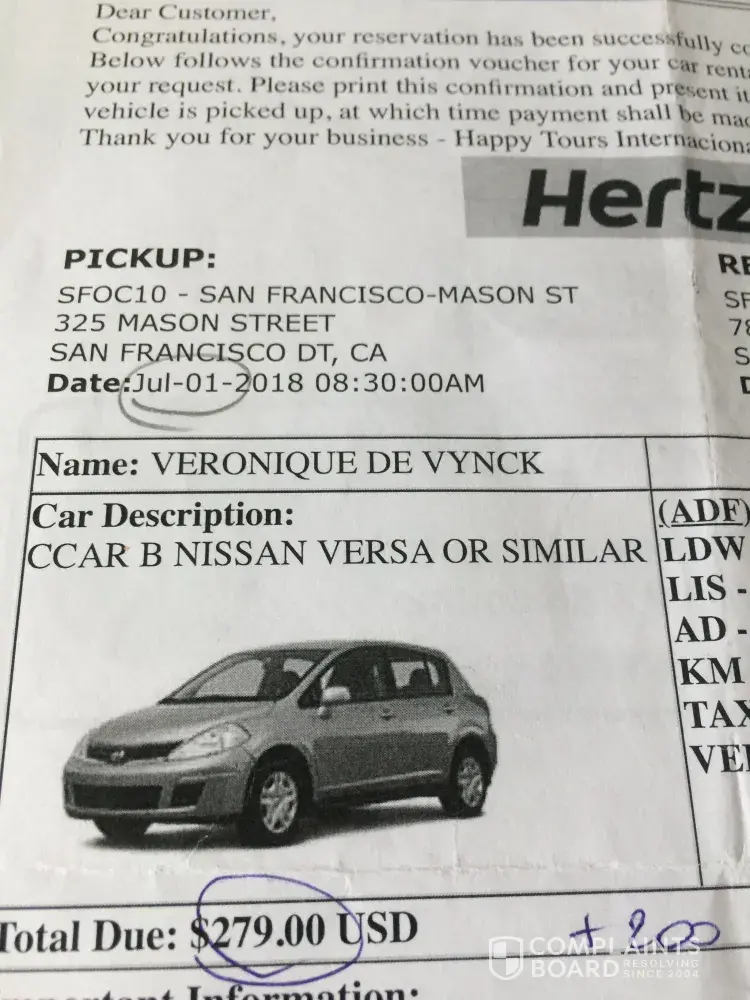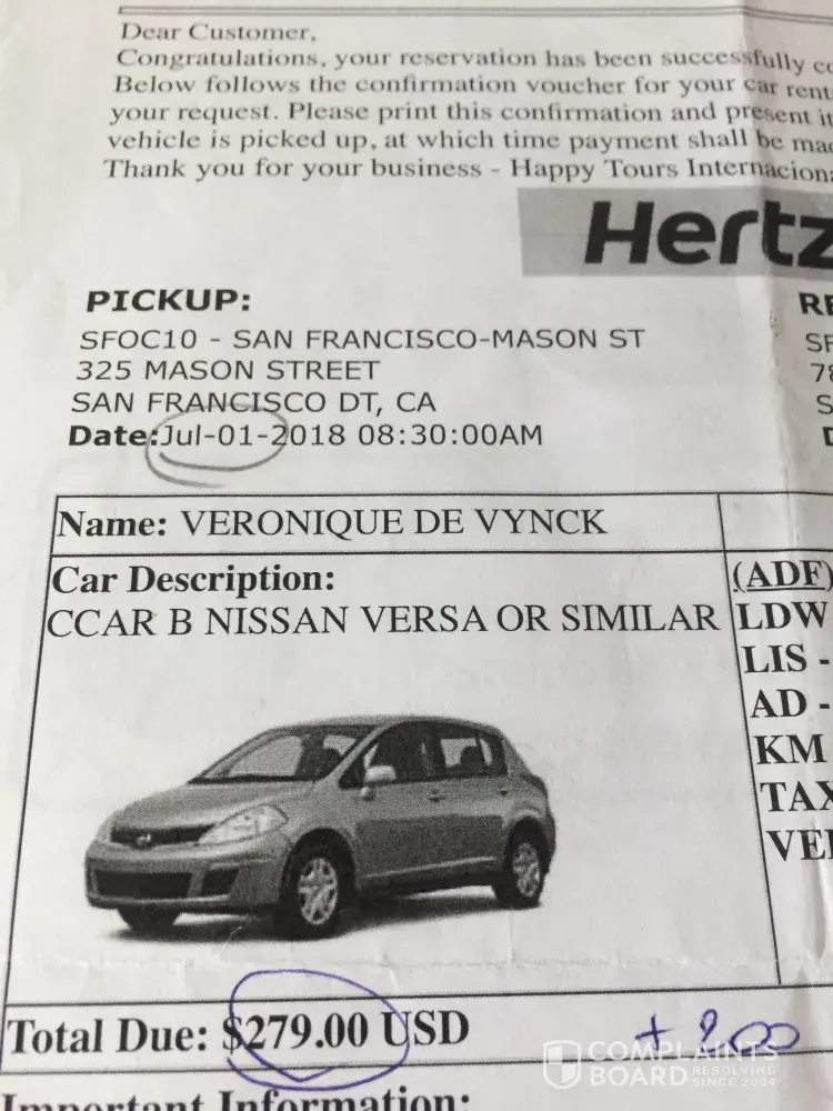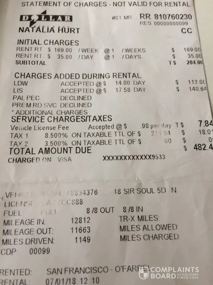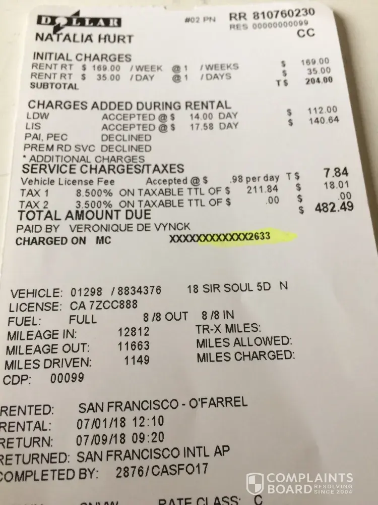 On the 1th of July, I rented a car at Herz (see attached doc). for 279 USD. The total price to pay was 479$, because I had to pay a deposit of 200 USD (reimbursed at the end). But the employe at the Herz office blocked my credit card after trying twice to get the payment done. To solve the problem, the manager of the Hertz office in SF -Mason street, guided me to Dollar. He told me Dollar has a close partnership with Hertz. He explained the encountered problem at the employe of Dollar and asked her to organise a car rental at the same price, which she did. I paid in total 482, 49 USD (see attached receipt). Because the amount was approximately the same as at the Herz office and because of the very confusing and stressful situation, I thought that I rented the car at the same conditions as at the Herz office (282, 49$ + 200 deposit). But when I brought the car back and asked for the reinbursement of the deposit of 200$, they told me that there was no deposit and that the extra fee corresponded with an insurance. I didn't gave my authorization for this extra insurance. The employe just added it to match the total price with the initial price as the Hertz manager asked her to do but she didn't realized that she changed the sales conditions. As my credit card was blocked at the Herz office I couldn't pay with it at Dollar. A friend of mine (Natalia Hurt) paid instead of me. This is the reason that I didn't checked myself the payment conditions. I told here it was ok because the amount was ok.