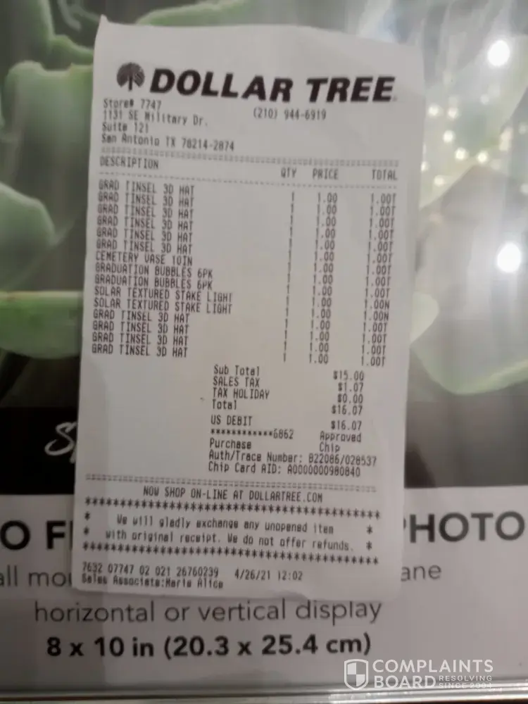 I felt that I was treated unprofessionally from the store manager, that had no name tag, and kept emphasizing that she was the manager but did nothing to look and see that the store stock was also broken. This [protected]@ store#[protected] SE Military Dr. Suite 121. San Antonio, TX [protected]. I've always been treated with outstanding service at this Dollar Tree in my neighborhood. I purchased these frames on 04/20/21. To top it off, when I walked in the store an associate looked at my return and approved it. His initials was RT on my receipt and told me to get what I needed. After my transaction was done, the manager put the two broken frames and the unopened one with my receipt into the original bag, gave it back to me and the cashier charged me for three solar light that I had exchanged it for. That was a total embarrassment to me and because I asked why, the manager said I know its not right, but that she did not make the rules dollar tree did on the receipt. When you put " no unopened items are exchanged". But clearly your store stock are broken through the see through package, something I did not noticed. Clearly when you hire managers you need to give them full empowerment to make the right decisions for the integrity of the company. Unfortunately for me I got the raw end of the stick.