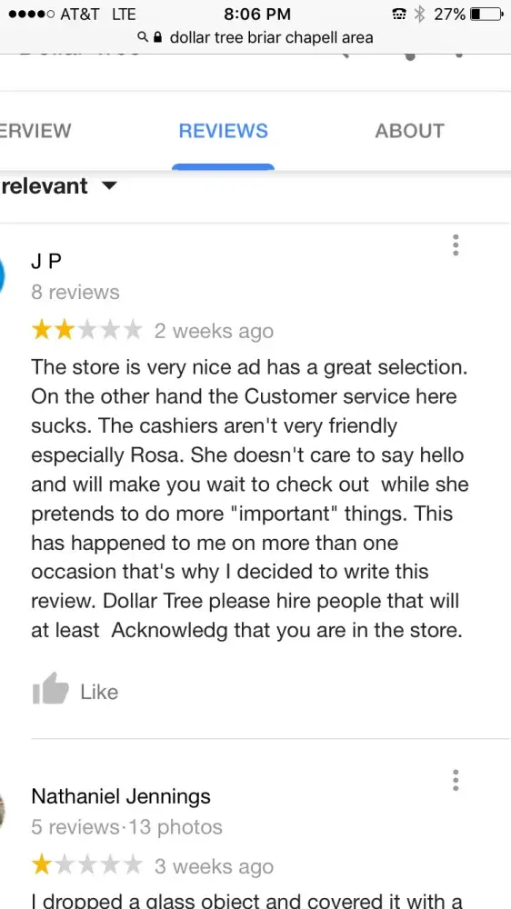 Miss Ena has really stood out to me on both trips to this location. On both occasions i was greated with a warm "welcome to dollar tree", was brought a hand basket when she saw i had my hands full of items, while at her register she asked "did you find everything you needed today?", she suggested items and upsold me on an item near the register, and even told me she hoped to see me again and to enjoy the rest of the evening. Such a sweetheart. But what i was not pleased with was when she requested back up, the manager (heavy set white woman with glasses) complained, had an attitude and was sitting on a crate on her phone not working! When she finally opened she only wanted the next person and only rang up one. She told others "she'll get you on two, im not open" she complained to another customer that she is overworked and that she's the best and fastest manager. She is lazy and is overall rude. I suggest a job that doesn't involve human interaction next time. You deprecate the company's reputation.