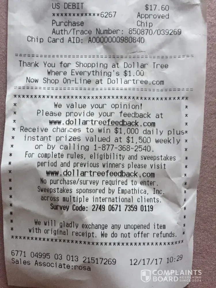 I clearly understand the return policy, but I worked retail for many years and some times you have to make exceptions. I received two makeup brushes in a gift basket, of course I don't have a receipt because I won this gift basket at a fund raiser. I kept everything else that was in this gift basket that clearly was purchased at the Dollar tree, wanted to exchange them for two items that I would use. I shop in this store at least twice a week, so it is not like I'm a stranger to the employees. Well I was there on 11-16-18, was I not only told by the checkout operator (Sue) that I could not do that, then the guy that was managing and standing at the other register told me VERY rudely and quite loudly that I could not do it. I may not be the youngest person, but I'm not hard of hearing! So yes, I do understand the policy, but NOW just the way I was treated, I will most likely never buy another item from that store. There are exceptions to every rule, and when you live in a small town like I do, you truly do not want to lose customers.