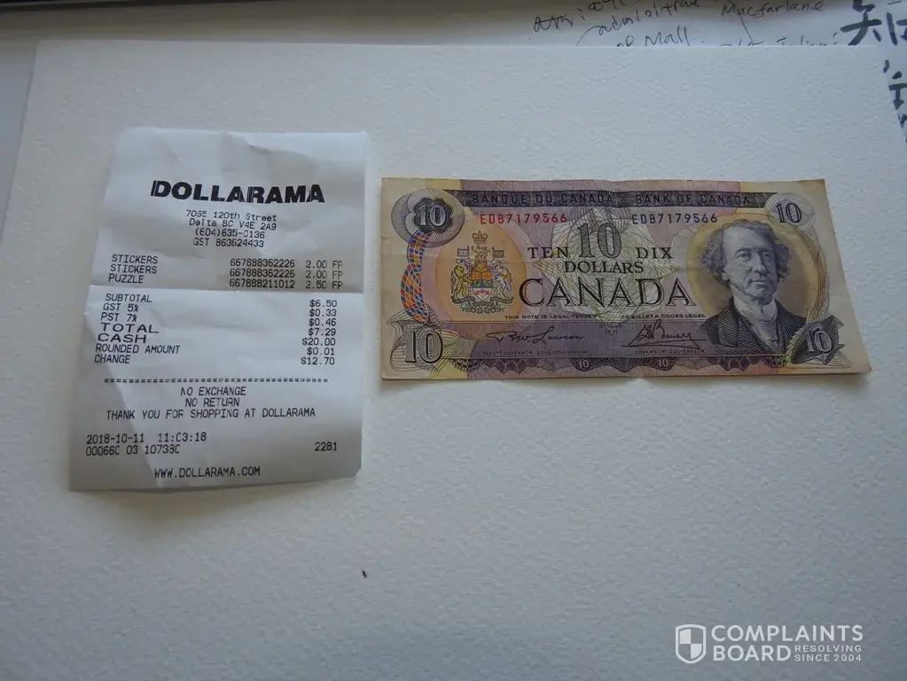 My friend is from Taiwan and came to visit me a week ago. I had a meeting for Cougar Creek Streamkeeper Team, and decided let her shopped inside the Scottsdale Mall alone. My friend was very upset, because she's been mistreated by Dollarama store employees. First, she took ten dollar bill (bill # EDB7179566, issued by Bank of Canada)to pay for the goods—$7.29, but the cashier said to her, "the bill is a fake." Then, my friend took a twenty dollar bill to pay for, the cashier only gave $5.70 changes to her which was shortened five dollars. My friend discussed this problem with this cashier, and she insisted that she gave her 2 five dollar bills. They argued about it and called the store manager. The manager recounted the cash register, and then finally found the cashier made a mistake. Second, my friend felt terribly about this shopping experience and wanted to return the goods and got her money back. However, the store manager used this language, "checked your receipt, no exchange and no return. "