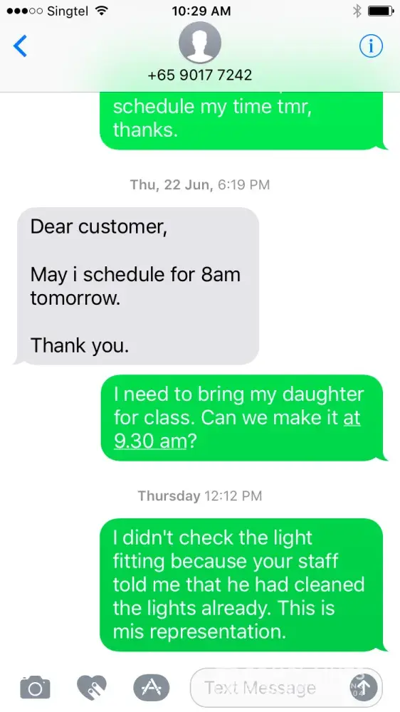 After 1 week, I went back with my parents who had come back from overseas. I realised that the light fittings in the bedrooms were still covered with thick layers of dust and one stack of kitchen cabinets were completely untouched! Also, the cooker hob (which I saw one of the staff cleaning) was still covered with thick grease. I called the management staff to highlight the light fittings. I was shocked that the staff insisted that since it was more than 24 hours, any feedback will not be entertained. (He had not informed me of this perviously). He said I had to pay extra $60 for transportation for his staff to come and clean the light fittings. I appealed to him to waive the charges as the cleaners had failed to deliver the scope of works. He remained unrelenting. I then told him that I will feedback this lack of service and he said go ahead. Im shocked at his attitude. I also tried calling him at least 5 times after my feedback at various times. Every time I called his handphone, it went into an engaged mode, shutting me completely out from communicating with him. I never had problem calling him previously. My SMS to him also remains unanswered till today.