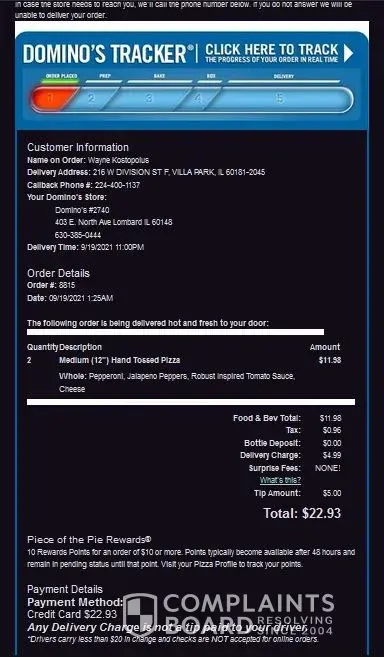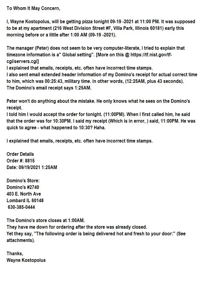 I, Wayne Kostopolus, will be getting pizza tonight 09-19 -2021 at 11:00 PM. It was supposed to be at my apartment (216 West Division Street #F, Villa Park, Illinois 60181) early this morning before or a little after 1:00 AM (09-19 -2021).