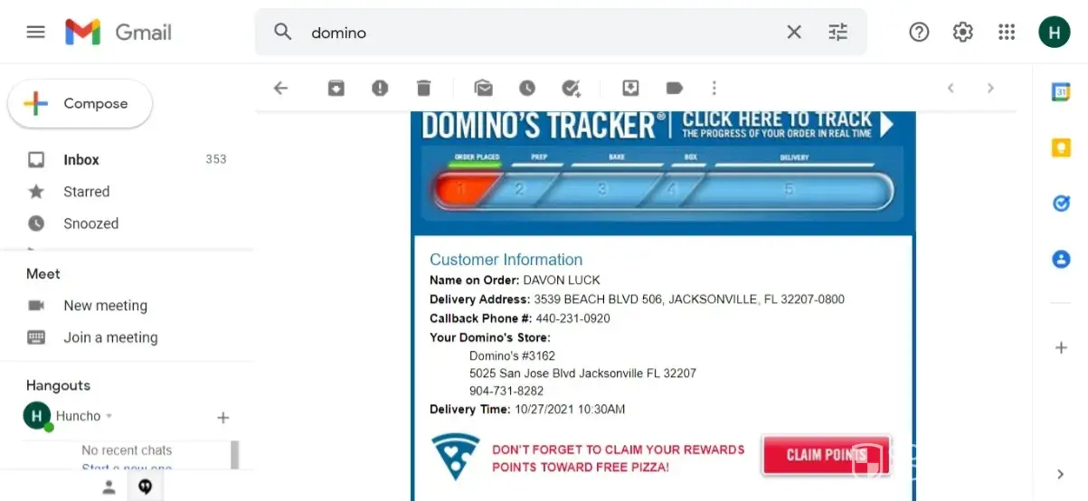 The Domino's email receipt says 1:25AM.