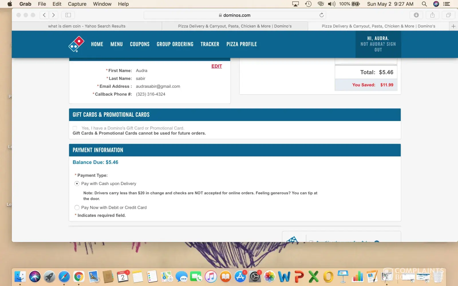 On today, May 2, 2021, I reached out to Dominoes at [protected] at 9:25am/pst. I spoke to a girl who answered, after holding online for almost five minutes, and explained to her that every time I try and use my rewards for a "Free Pizza" when I go to submit the offer, it returns an error message each and every time. I have tried this offer for several...