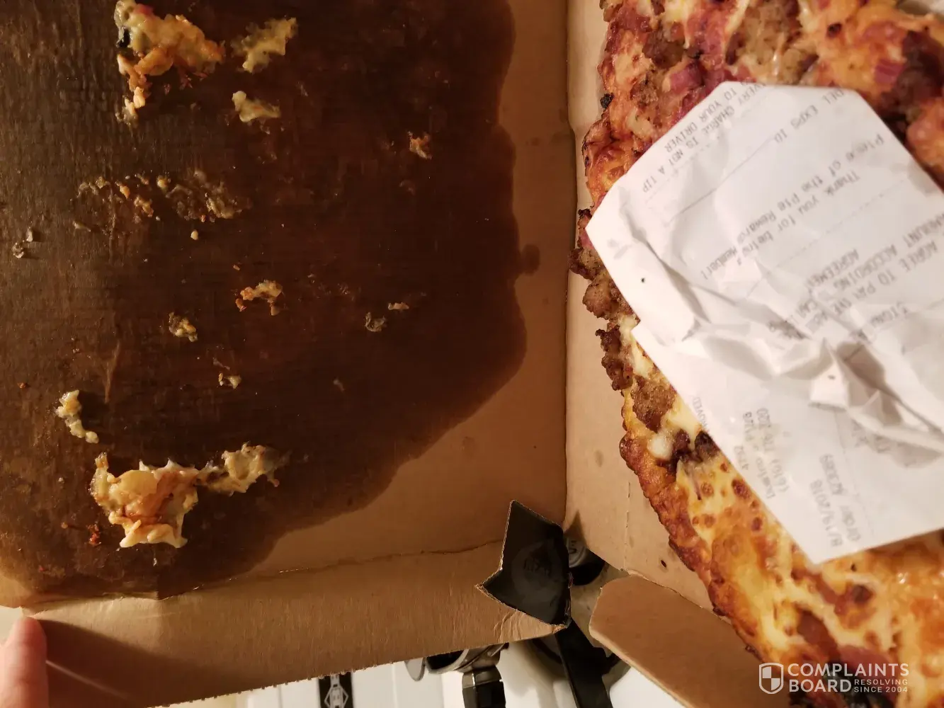 I order a thin large pizza Philly cheese steak it was all stuck to the Box he had a little burnt spot on the top it was not enough toppings to that pizza to taste and we got two people eating this pizza I would never order from Domino's again I just want you to know that I just think that is wrong and I did not get no receipt I thought that was strange I live on 3311 12th Street my phone number is [protected] I tried to take a picture but my tablet would not let me do it but I never ate no piece that was stuck in the Box I guess I'll be going back to Little Caesar I just thought y'all need to know thank you