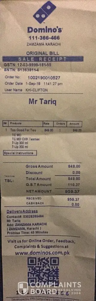 Today on 1st Sep 2018, I went to Domino Zamzama Karachi Outlet and ordered a "Two Good for Two, Tax Max pizza, when came home and start eating I found a piece of bone in the Pizza. I have complained at concerned Branch but no action have taken to satisfy me. Copy of my order attached for the refrance. When I pay premium price for a premium pizza then I expect a premium pizza but unfortunately I am highly disappointed from the attitude of your Zamzma, DHA, Karachi, Pakistan Outlet and demand a full inquiry of this matter.