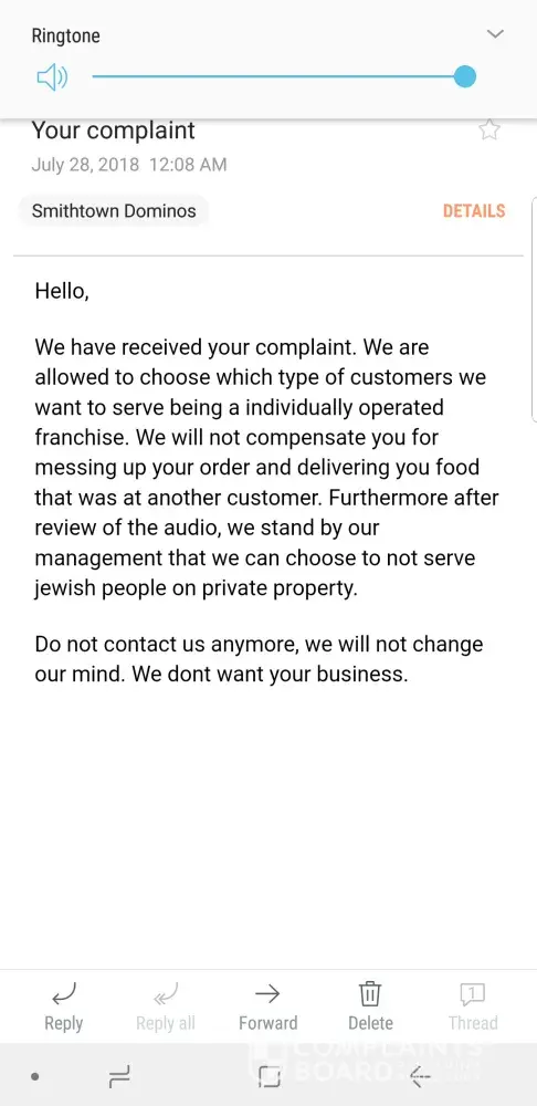 I spent over $1, 000 a month at this dominos. I was a loyal customer. On july 24, 2018 I ordered food. The driver ended up bringing the wrong food, cursing infront of my and my friends. His name was samuel, extremely unprofessional. He called the manager and the manager said to keep the wrong food for free, and will replace the entire order. They come back over an hour later missing more food. They refused to refund me until i spent an hour on the phone and had to drive there. I wasted my gas, my time, had my tip robbed from me. I was discriminated by the manager giovanni who made fun of me for asking for a refund saying im a fat jew and obviously i have money and eat well and shouldnt have to request a refund.
