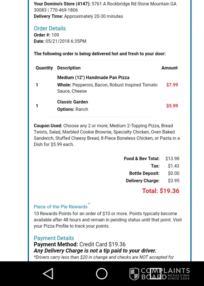 The last two times I have ordered from Domino's there has been an issue with my delivery order. It's the time. I've been ordering from this Domino's for the past two years I do know at least. They have always been late but they started getting later and later like up to an hour for delivery and I'm 5 minutes away from the store. The last time I had an issue they issue me a refund gave me the full for free and told me that I wouldn't have this issue again. I ordered again tonight on the app it shows that the food was already here but the food had not arrived. I called to the store and the manager of the store said oh that's a glitch between the app and their store that that will always be ahead of them. That's false advertising for one and I sat patiently and waited for the driver to arrive. Over our head pass I called back to the store and they said the driver said he came and nobody answered the door. I have cameras in and around my home. He never showed up and I was sitting at the door. Even before I ordered to come downstairs there was a 20-minute Gap he never rung the doorbell. So now I have to wait 3 to 5 days to get my money back from Domino's and I didn't get any pizza. 8 and a half months pregnant and I just really did not feel like cooking and now dinner is ruined for the night. When I call back to speak with the manager he had a complete attitude. And that well will give you a refund your money back on your card and hung up. Even though I'm never using this Domino's again and probably any other Domino's just because they're individually owned they're making the brand look bad