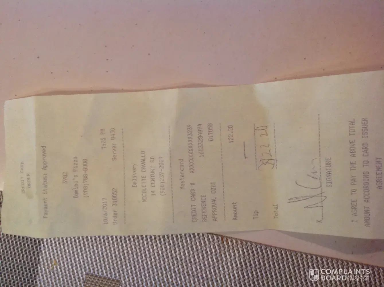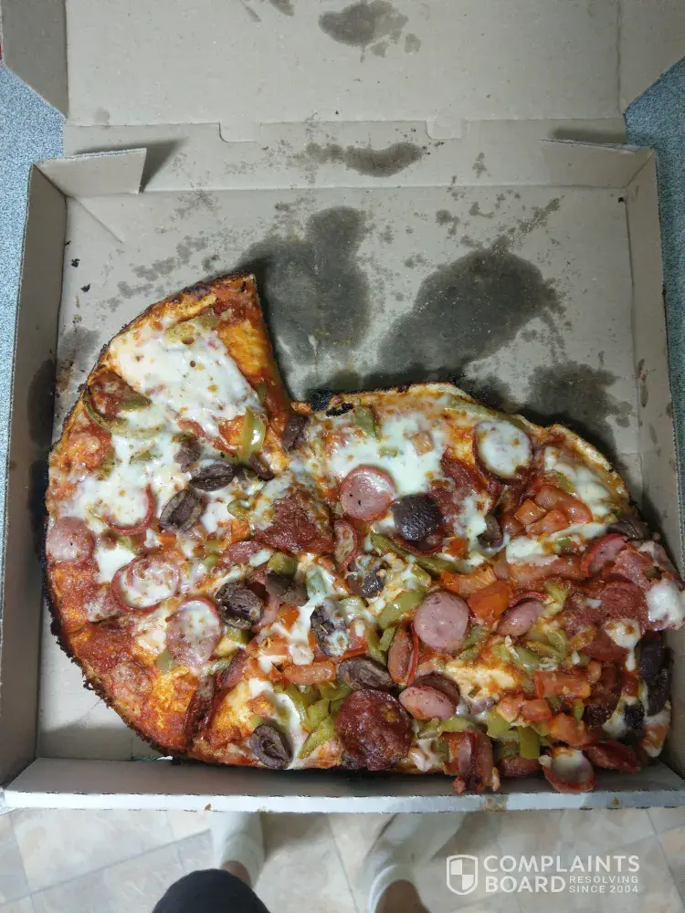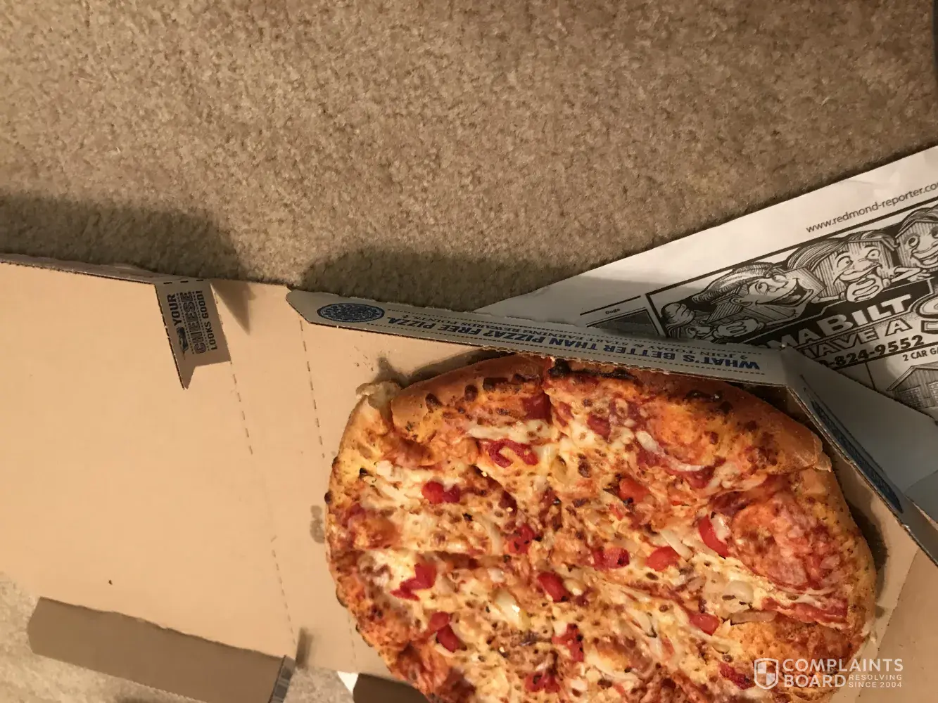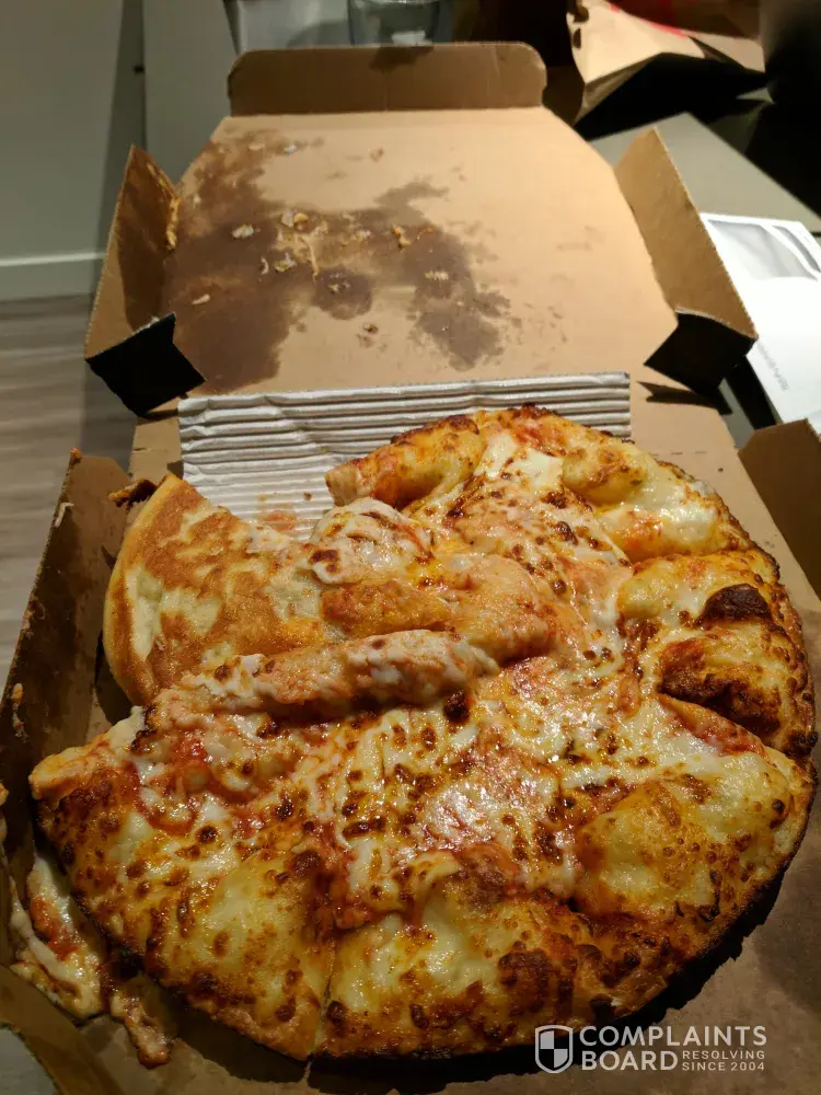The pizza was delivered and half of it was upside down with cheese sticking to the bottom of the box. The quality of the pizza was also really bad with a hair sticking out of one slice and additionally the pizza was cold by the time it arrived. I have attached a picture with this message.