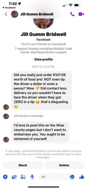 I am an emergency room nurse at a local hospital, which has been extremely busy lately. On Saturday night, I decided to order enough pizza to feed all the staff present that night. While I was ordering online, I was notified that there was a Level 1 traumatic CPR patient coming to one of my rooms. I finished the order just as the patient was wheeled into the room. I chose contactless delivery because I knew that I was likely going to be busy for quite some time. We managed to resuscitate the patient and flew him to a larger trauma center, where he was immediately taken to surgery. The entire staff, security officers, housekeeping, physicians, and (when they got back) the flight crew enjoyed delicious cold pizza and pasta! We are very used to eating when there is a gap to grab something, and your product was much appreciated. The next morning I checked my phone and there was a Facebook message for me. I am sending a screenshot of it. I never would have neglected to put a tip for the driver if I hadn't been so rushed getting to the trauma patient. I do not think the Facebook message and/or threat is appropriate. I would have gone by the store and tipped the delivery person, but don't want to cause more drama. This certainly gives a negative feeling towards ordering from Dominos again. I did regularly use this store.