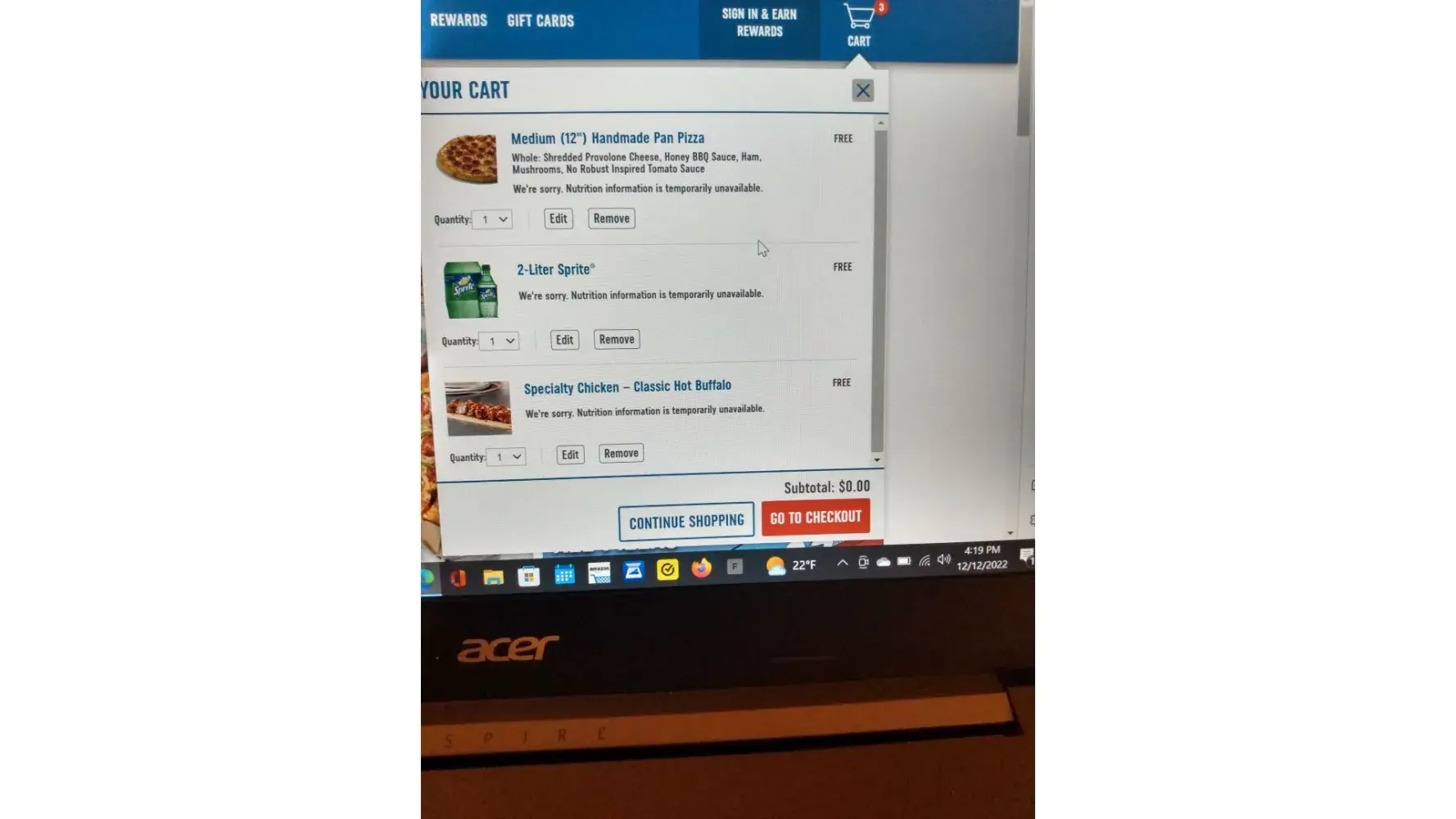 Free Med Pizza Free Pop Free Chicken it would not go through on the app or online. Called store and was told the only way they would be able to Honor that was through the app or online. told them it would not work. they said I could order over the phone but would have to pay. What a joke and con game You are playing. look at the picture. g.[protected]@outlook.com