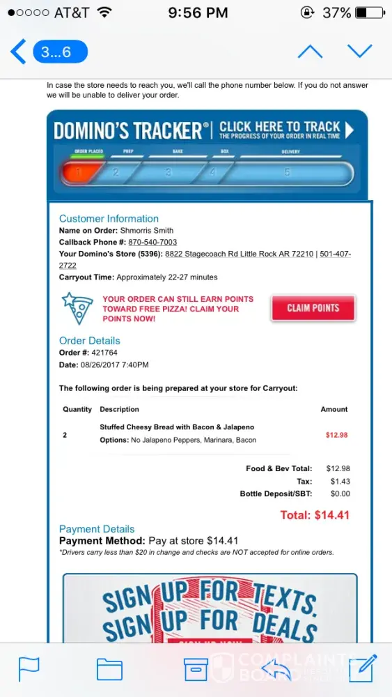 Hello, My name is Shmorris Smith! I ordered 2 Boxes of Chees Bread No Jalepenos With Bacon and Marinara Sauce from Dominos @ 8822 Stagecoach Rd Little Rock, AR 72210 Loccation. It took about 22minutes for them to make and when I got to the store to pick it up the order wasn't correct the didn't put bacon in it. Drove all the way back to the store and told them that my order was incorrect. One of the employees told me that I was going to be about a 2hour wait. I asked for a refund and he told me that he don't think he can do that! So they told me they were going to remake it went back and sat in my car for about 30minutes and asked for my order they gave me the 2 boxes I checked the boxes it was the same cheese bread that I pulled apart on each order. So the manager stepped in, in made it himself. I waited for New cheese bread for a 1hr & 35min. Checked my order and it was loads of Jalepeno peppers in it. And I'm allergic to jalepeno peppers. I'm at the hospital trying to stop from suing but I need some to fix this.