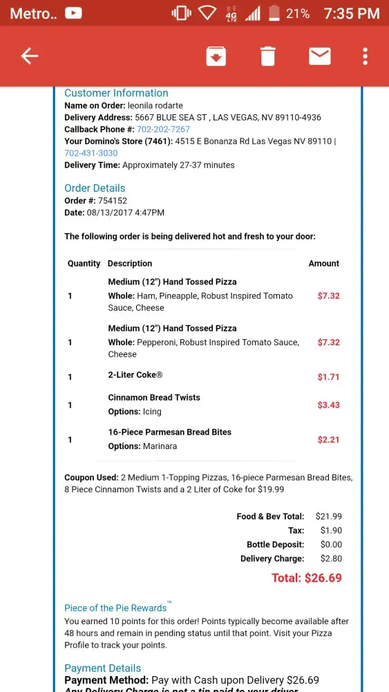 I placed a order for dilivery today 8/13/2017 I got a coupon from the website 2 medium 1 topping 16 pice parmesan and cinimon twist and a 2 letter for 19.99