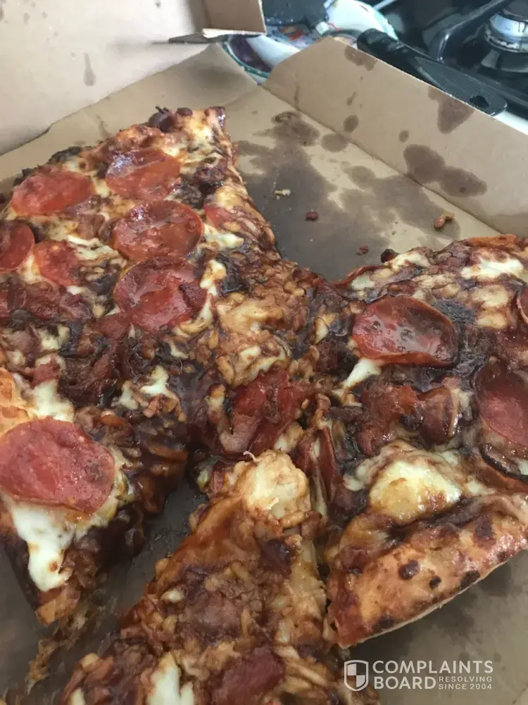 I ordered two 12" pizzas online and it was delivered on time. But, the pizzas were either a day or two old or they were cooked and overcooked. I have the picture attached for your reference. My friends and I are offended. The location is below: