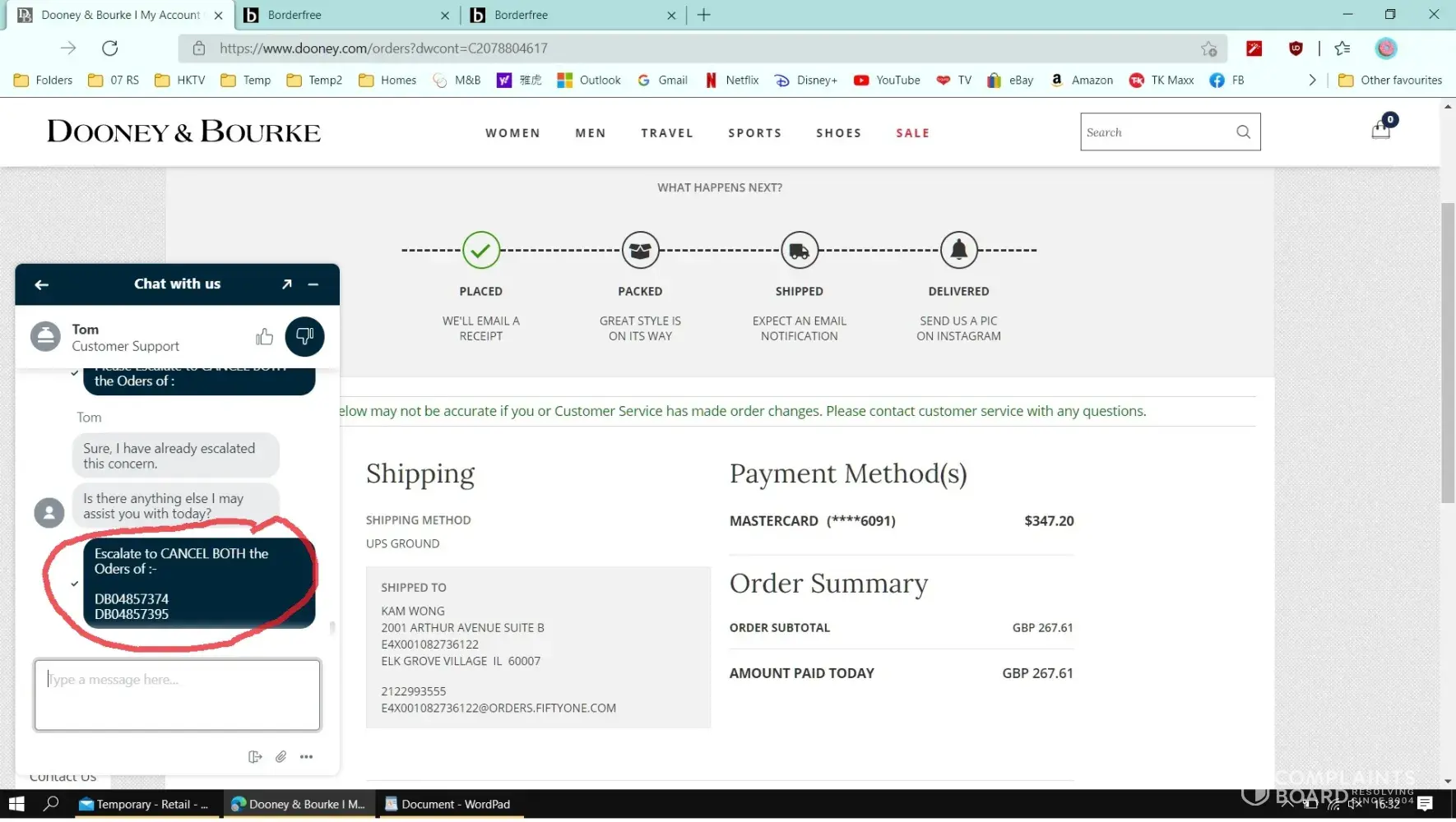 After much confusing correspondence with Tom via Live Chat, I requested cancellation of both DB04857374 + DB04857395 Orders.