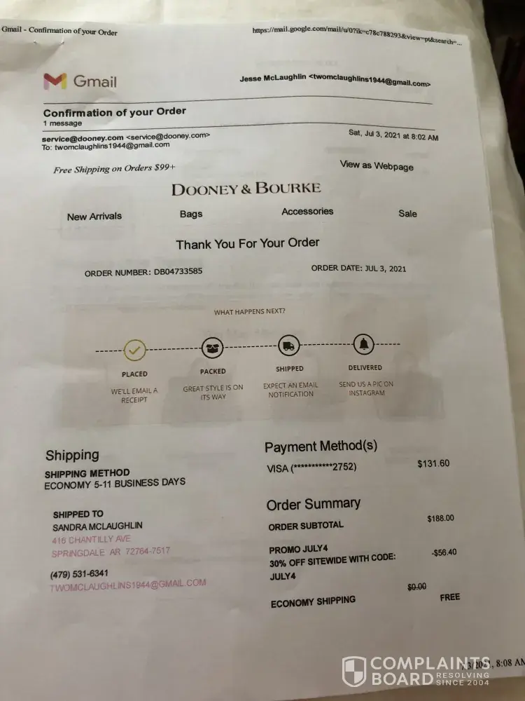 On April 27, 2021, I ordered two items from Dooney & Bourke and I mistakenly put in the wrong shipping address. I noticed the mistake and called the company the on morning on April 28, 2021 and was told that they would update my address and send items to correct address. I was given a tracker ticket number 332359. I have called again on May 5, 2021 to get a status and was told that since it had not gone out it would be send to the address that I updated on April 28, 2021 and I was given another tracker ticket number 344272. My husband received a telephone call from the post office at Fort Meade, MD stating that they had a package but it could not be delivered since we had not lived there since 2019. I called D&B on May 5, 2021, telling them about the problem and was told to to call UPS asking them not to deliver, which I did and was told that only the company could make and request the change. I again called D&B and was told that I would have to wait about 2 weeks for them to find the problem and that I could be able to get a replacement of the items. Today, May 25, 2021, I received this email :