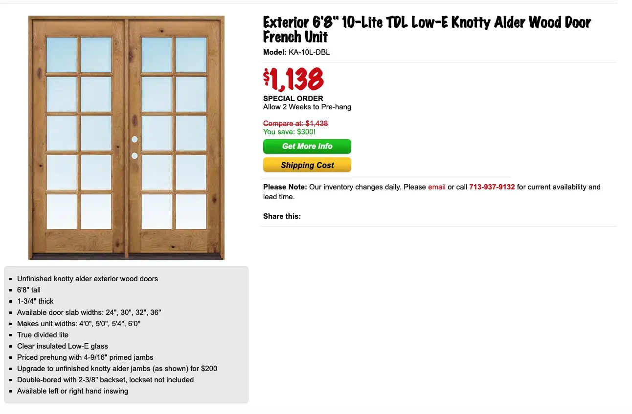 Door Clearance Center boosts 10 patio doors on their website with prices ranging from $299 - $899, but arriving at their store was told only had 1 patio door and it costs $799. Looks like the website is a come on to get you in the door.