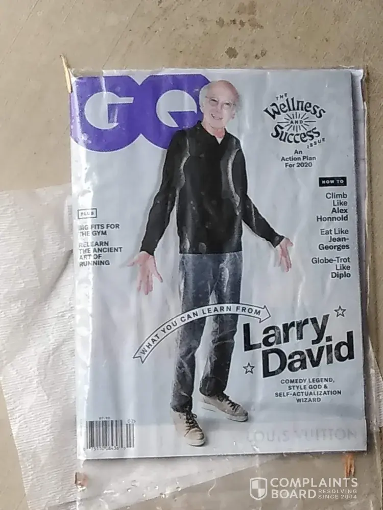 Hi, My magazine was delivered but it was thrown in my driveway in the rain and it was destroyed. My covered patio was only a few feet away. The magazine is GQ and it is valued at $7.99. Although it has a light plastic cover, it was still soaked thru and destroyed. My address is