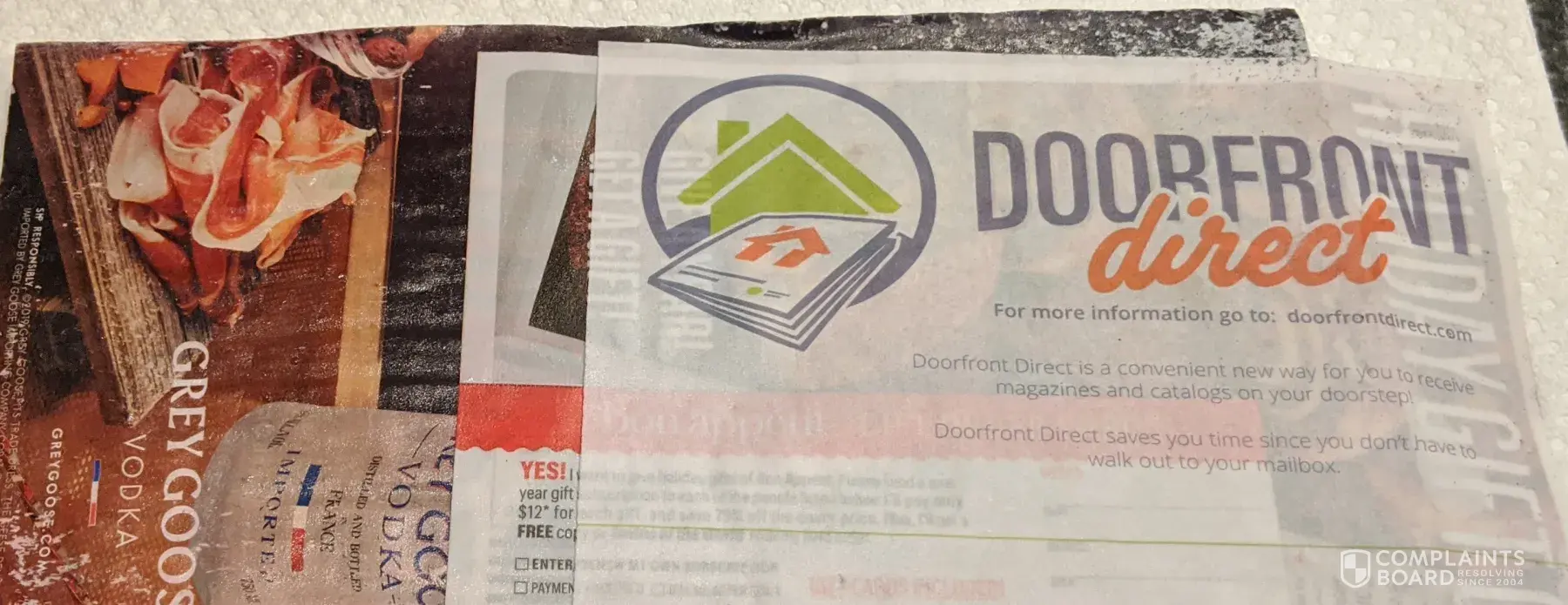 This service is supposed to deposit your magazine on your doorstep the 1st time, it was in a puddle in front of my garage, this time it was behind my husbands truck at the bottom of the driveway. This is my second complaint this service is garbage. Any magazine I receive using Doorfront direct is being cancelled. In future I will buy all my magazines at the local book store that way I will be sure to get them, not wet and soggy or stolen.