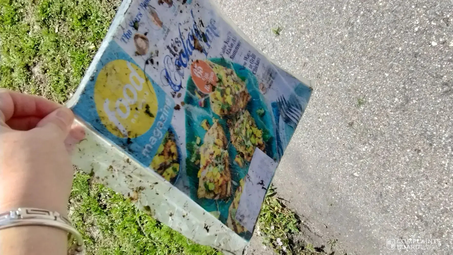 Magazine was thrown through the gate (which was unlocked) onto the sidewalk & RAIN drenched it. I am still trying to dry it out!