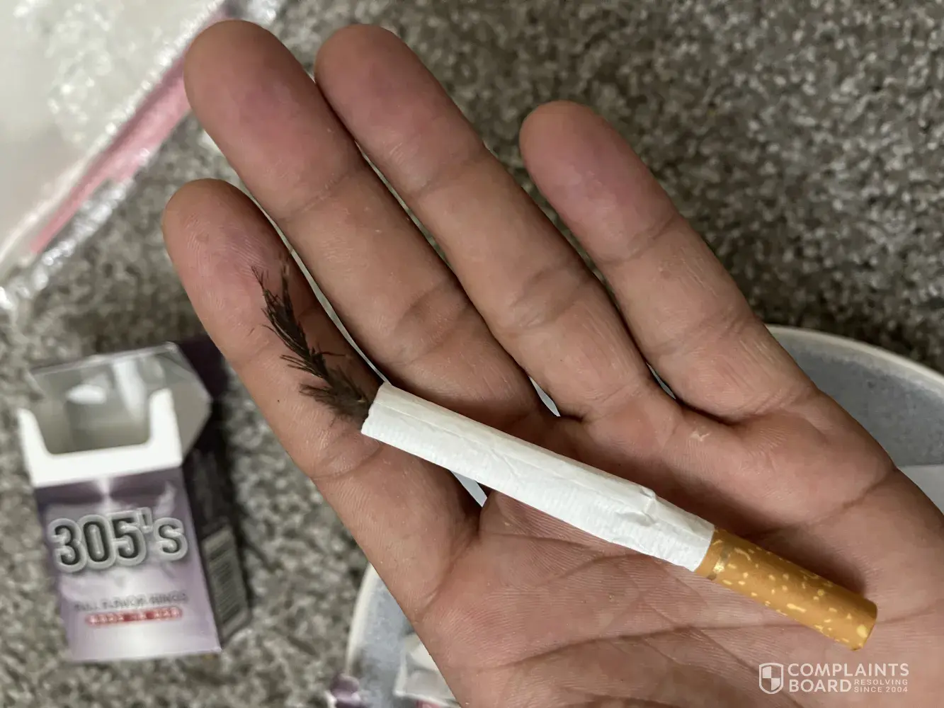 I'm writing to complain about 305 100 Purple Regular Flavor Cigarettes I've enjoyed using your product in the past but when I bought my last carton. Just about everyone one of the cigarettes in the carton the filter pulled apart from the tobacco as if they were not glued I guess. Never seen this happen before in my life. Very irritating but I could not return because I didn't have a receipt.