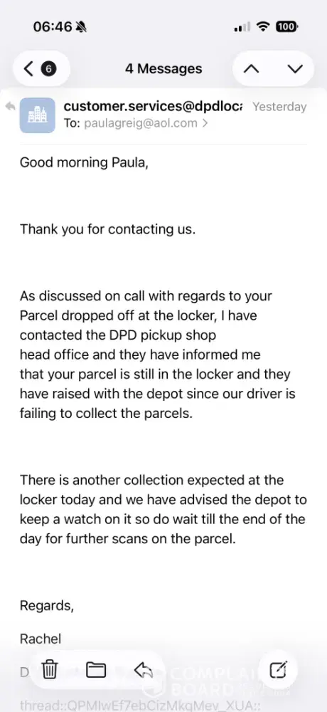 Contacted DPD online chat, they said the delivery hadn't been made and the parcels were still at depot. Unable to go further they told me to contact customer services by phone, again l was told the parcels were still at depot, this was despite me having a photo of them at the delivery address. I said l wanted the parcels collected and delivered on the scheduled day. The agent stated he would have to contact the depot manager by email and as it was late Friday afternoon l would be contacted Saturday morning.