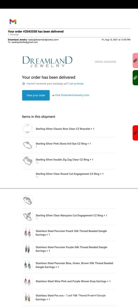 I'm not complaining about this company but rather, the person who wrote the scathing report against them. On the evening of 12/6/2016, I ordered 2 Sterling Silver rings on line from Dreamland Jewelry. This is the 2nd (but not my last) time I've ordered something from this company. The 1st time I got a .925 S.S. chain that was free-I only had to pay the shipping. It was a very nice chain which I later sold with a small pendant attached to it. This time I once again, received an offer for a free item which was a very pretty ring & I also ordered another ring that I liked. The shipping was the same price as if I had only purchased the free one. Today I received my order with both rings & I only used "standard shipping" for my order. So, I think the person who had bad things to say about Dreamland must have had a rare experience with them as both of my experiences with them went smoothly.