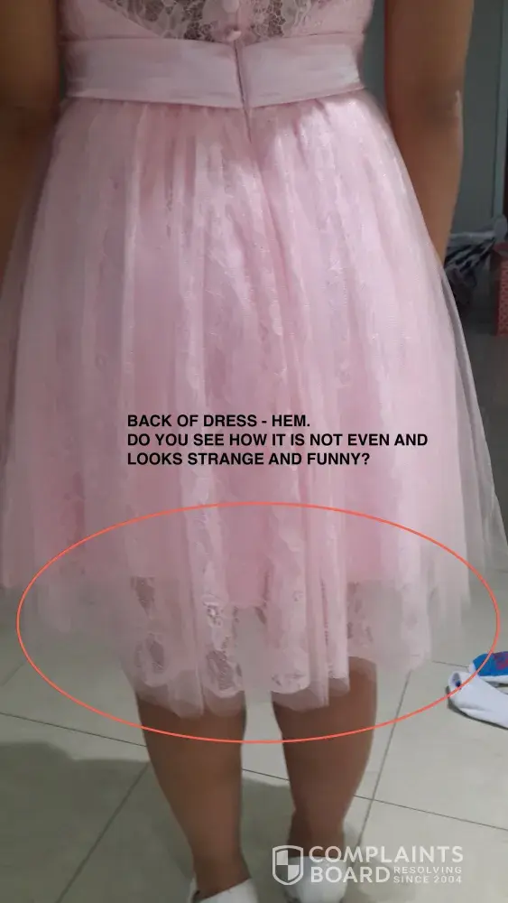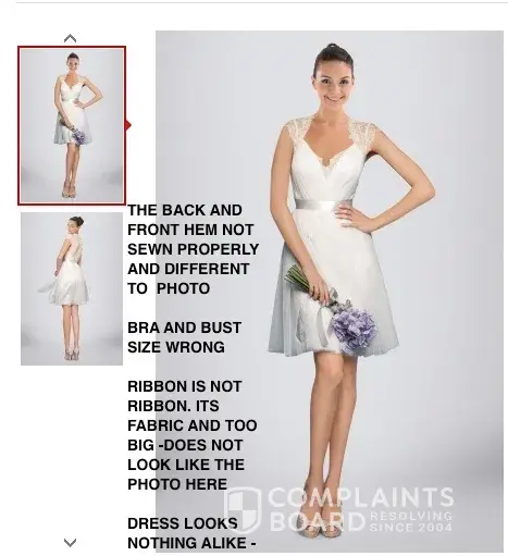 I had the same problem! First they called me hundred times to confirm the size, and then to tell me the dress would be late, and when it finally arrived, i had a shock! it was horrible! nothing to do with the dress from the photo! not only the size was wrong, but the whole design was...grrrr...totally different and horrible! of course i emailed them they asked for the "proof" as they said, i sent lots of photos, i circled the differences which were obvious and they kept telling me photos were not valid proof! i mean, what else to say? if you have eyes, you see where the problem is! So, is there anything we can do about this company who rip you off and then disappear? can they really do this?